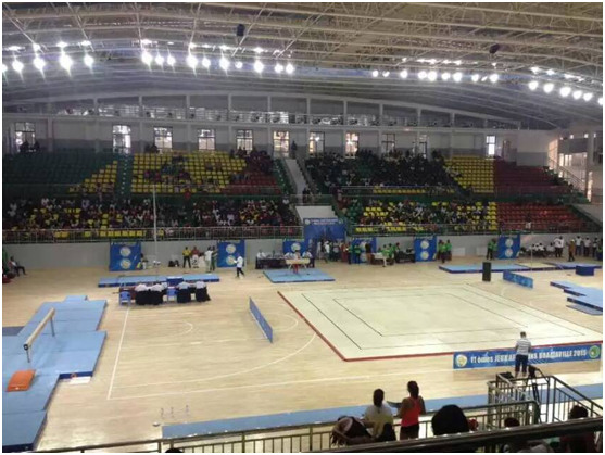 Congo (Brazzaville) Maklekele Gymnasium is a newly built modern gymnasium for the Games, which can accommodate 3000 people. It mainly undertakes the basketball and gymnastics competitions of the Games. Our company has undertaken the construction of some sports technology in the center. Including: basketball floor surface construction, bleacher seats, professional competition lighting system, sound reinforcement system, intelligent flag raising, fire alarm system, monitoring system, sports equipment installation, imported PVC surface installation and laying, competition guarantee and operation during the Games, etc.