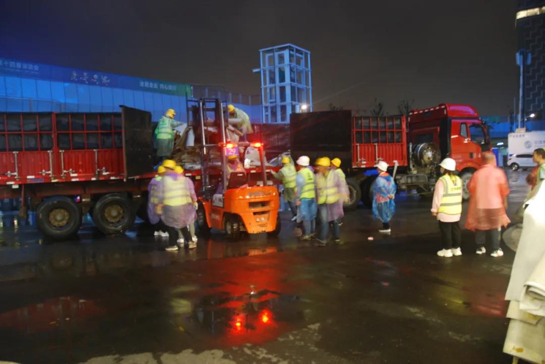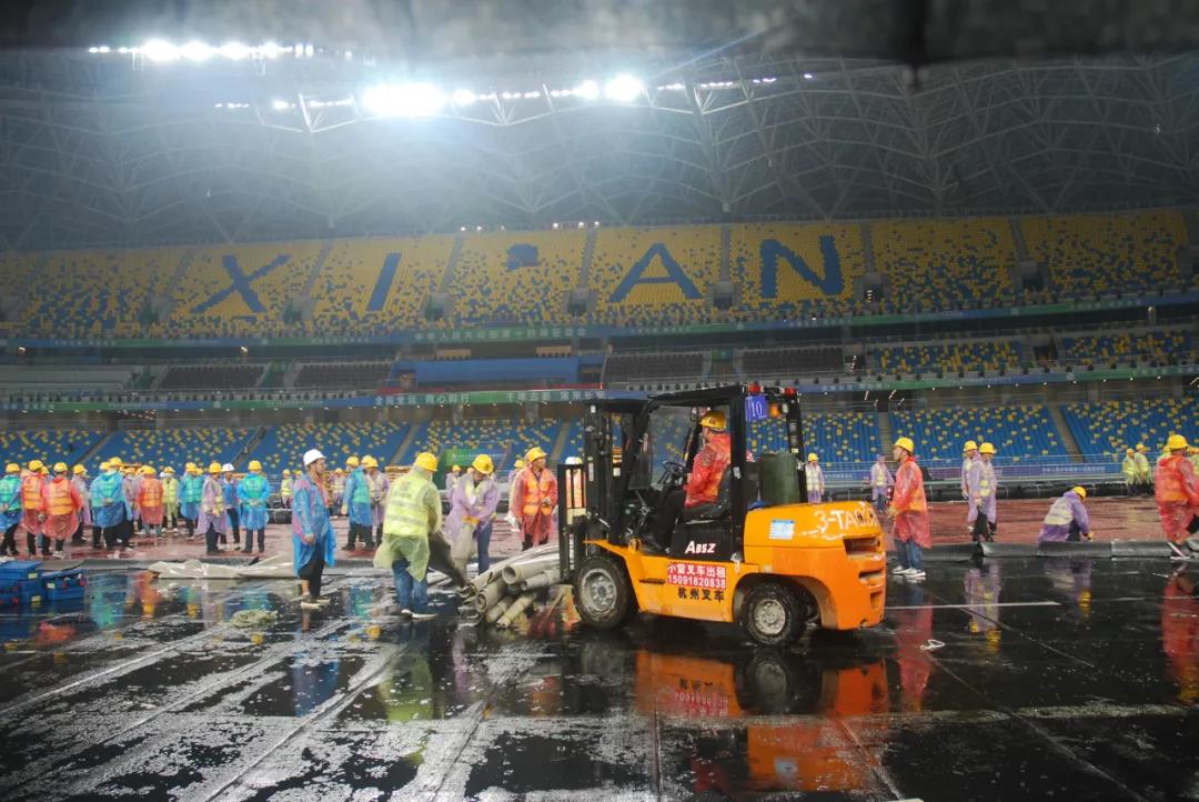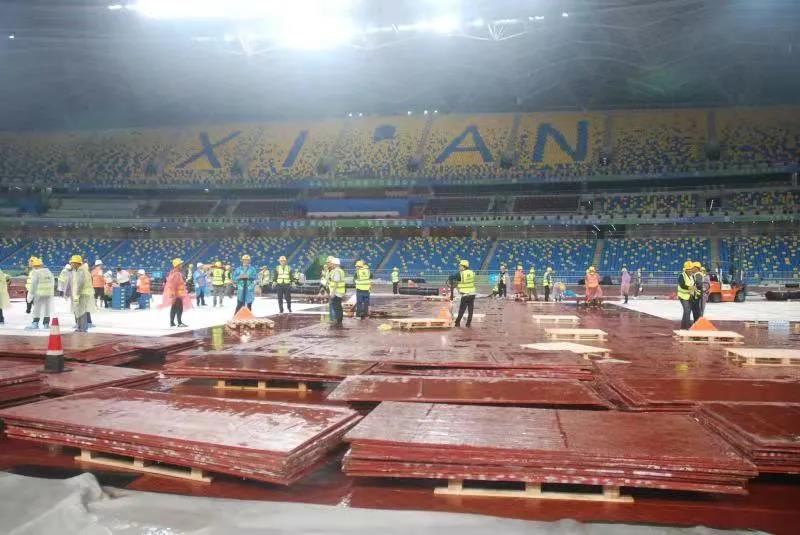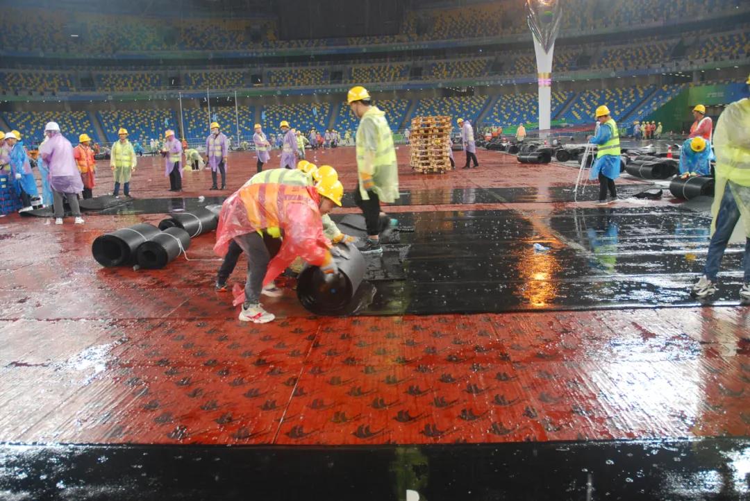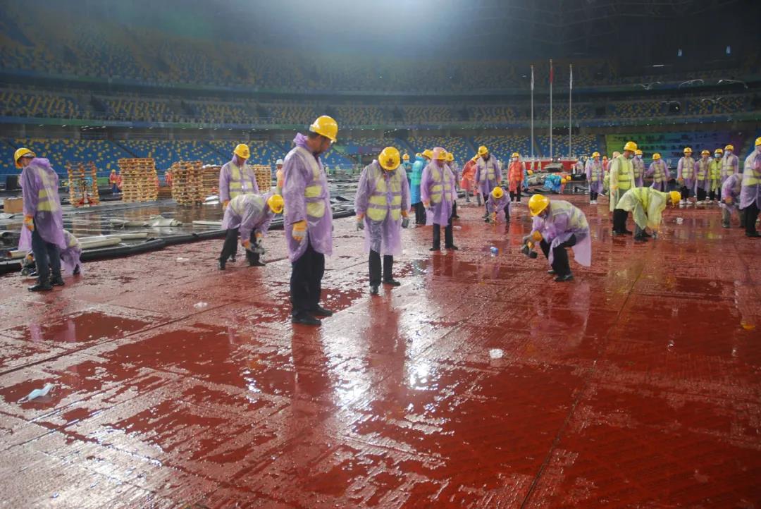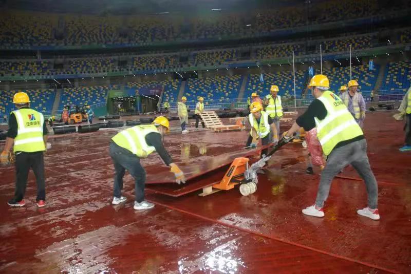 In order to ensure safe and orderly construction, the site is divided into 15 teams, including removal group, nail cutting group, rubber cutting group, packing group, loading group, logistics support group and safety emergency group. More than 200 transport vehicles and mechanical equipments were put into use, including 40 heavy trucks, 35 transport trucks, 30 forklifts, 50 consignors and more than 50 hand-held cutting machines. At 0:30 on September 16th, the ceremony was officially kicked off. More than 500 support personnel of Pan-China Sports entered the venue in spite of the wind and rain to start the construction work. At 2:30, the removal of more than 20,000 flat anti-skid mats was completed. At 4:00, the removal of rubber mats was completed. At 8:50, more than 9,400 pieces of bamboo plywood were removed 1 hour and 10 minutes ahead of schedule. It took 8 hours and 20 minutes to complete the removal and transportation of more than 800 tons materials in the field core, and the removal task was successfully completed!
