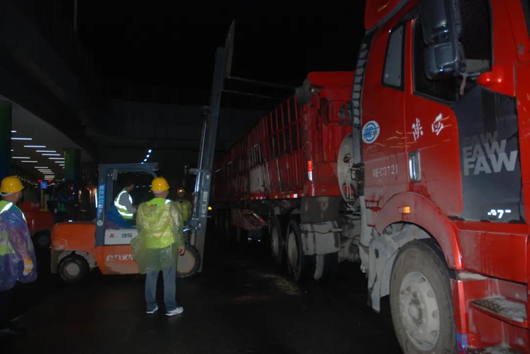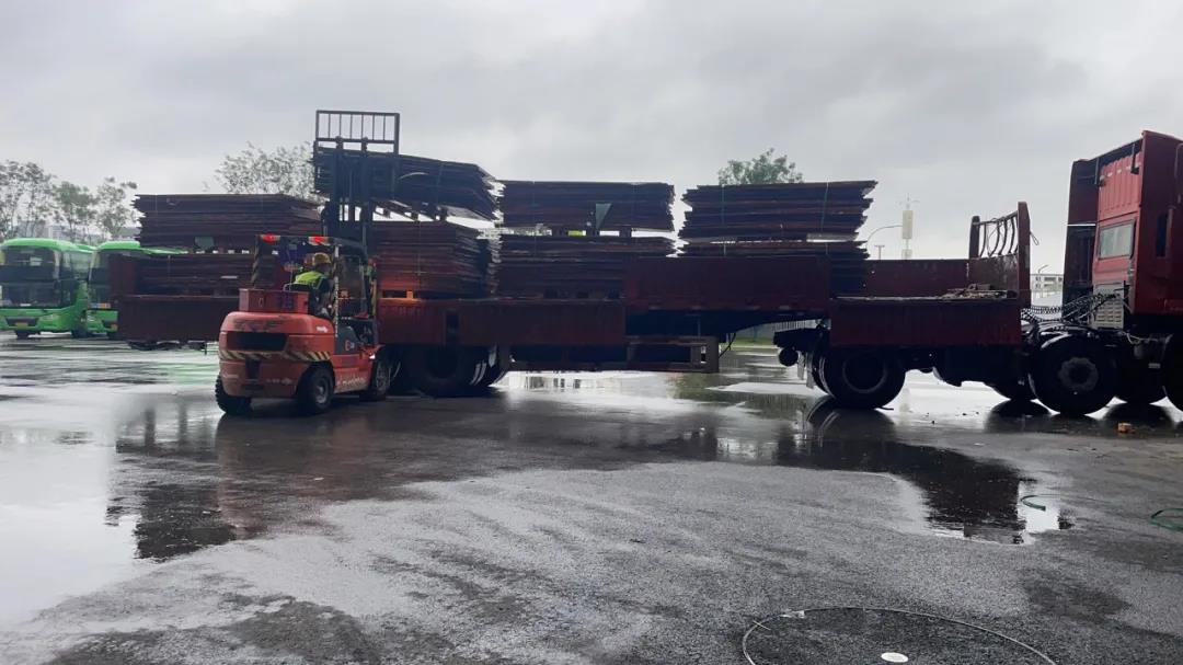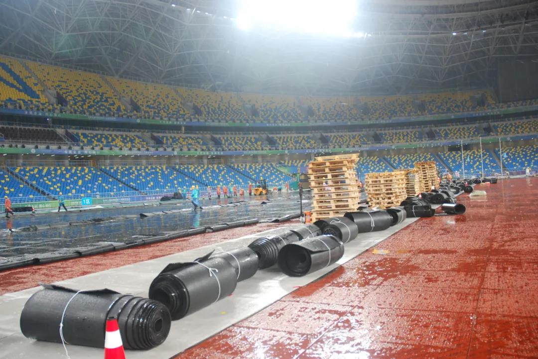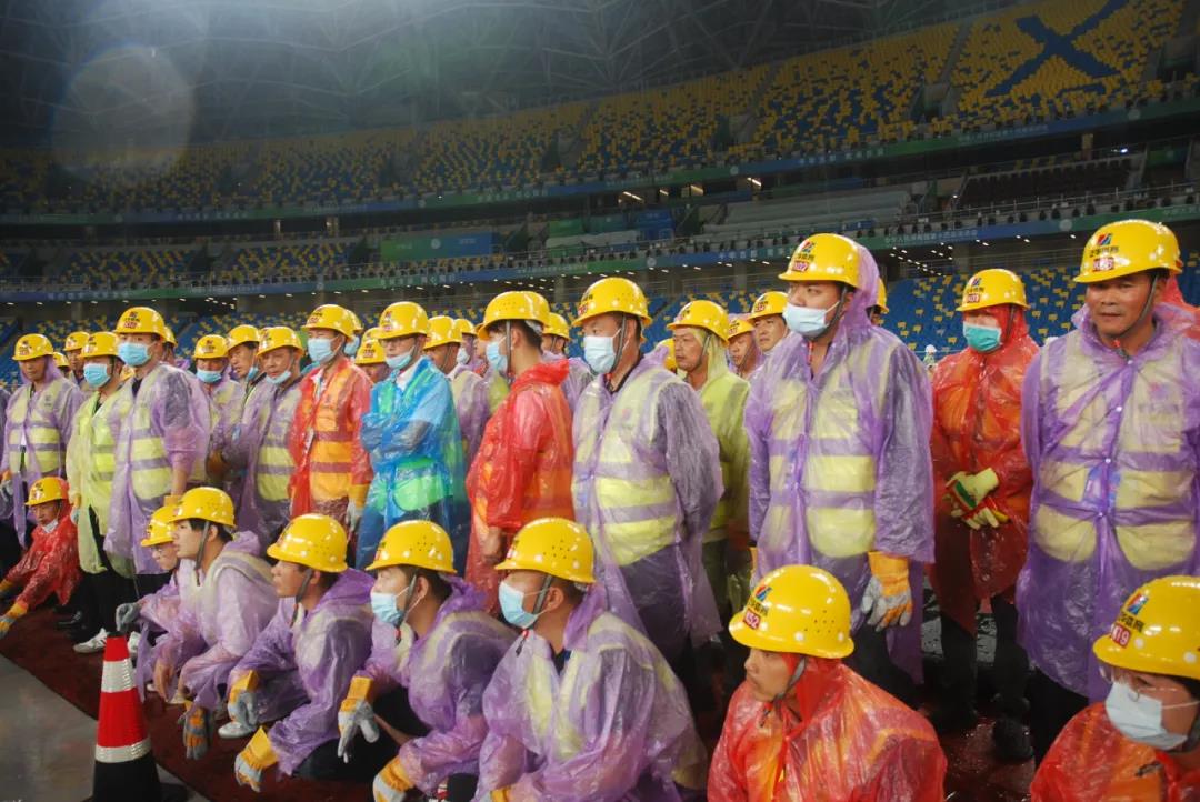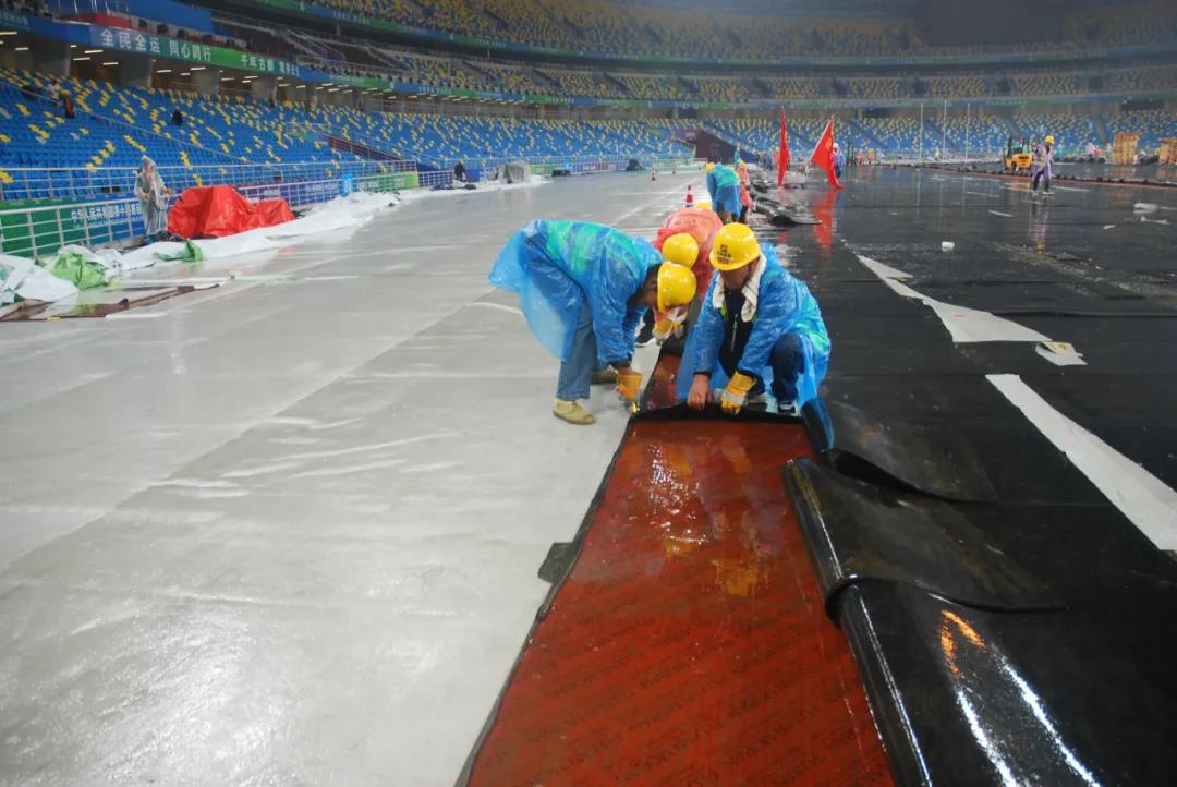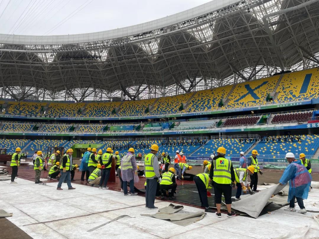 In order to ensure safe and orderly construction, the site is divided into 15 teams, including removal group, nail cutting group, rubber cutting group, packing group, loading group, logistics support group and safety emergency group. More than 200 transport vehicles and mechanical equipments were put into use, including 40 heavy trucks, 35 transport trucks, 30 forklifts, 50 consignors and more than 50 hand-held cutting machines. At 0:30 on September 16th, the ceremony was officially kicked off. More than 500 support personnel of Pan-China Sports entered the venue in spite of the wind and rain to start the construction work. At 2:30, the removal of more than 20,000 flat anti-skid mats was completed. At 4:00, the removal of rubber mats was completed. At 8:50, more than 9,400 pieces of bamboo plywood were removed 1 hour and 10 minutes ahead of schedule. It took 8 hours and 20 minutes to complete the removal and transportation of more than 800 tons materials in the field core, and the removal task was successfully completed!