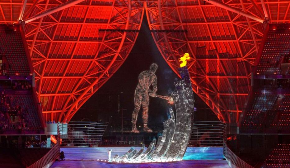 At 9:53 p.m., the main torch lighting ceremony began. The Olympic flame for the Asian Games, collected from the Liangzhu Ancient City Ruins, began its relay across Zhejiang Province on September 8th and finally arrived at the Hangzhou Olympic Sports Center Stadium. Under the watchful eyes of the public, the last torchbearer, Wang Shun, along with the "Digital torchbearer", lit the main torch tower of "Qiantang River Tide Surging", and the Asian Games sacred flame blazed brightly.