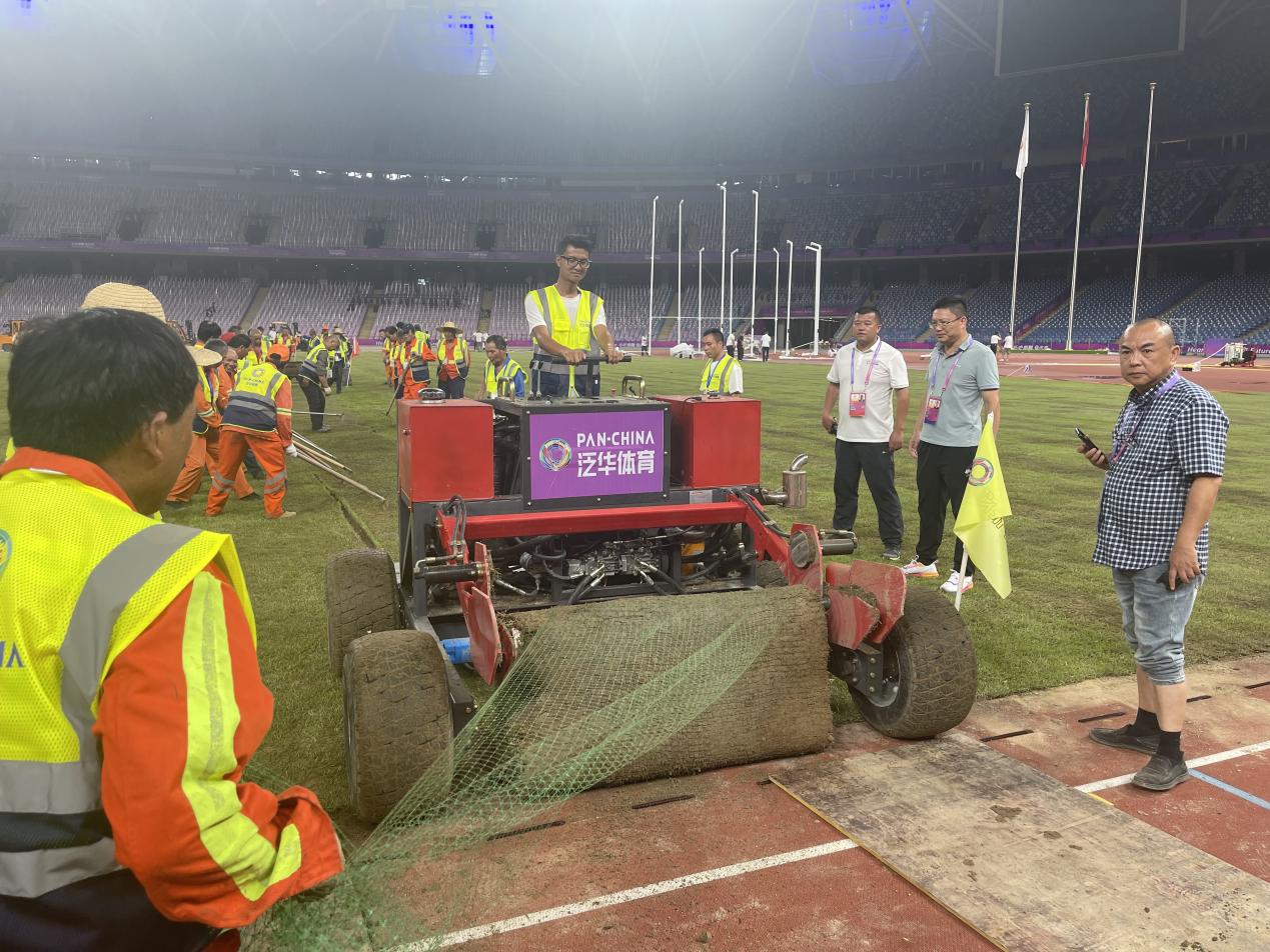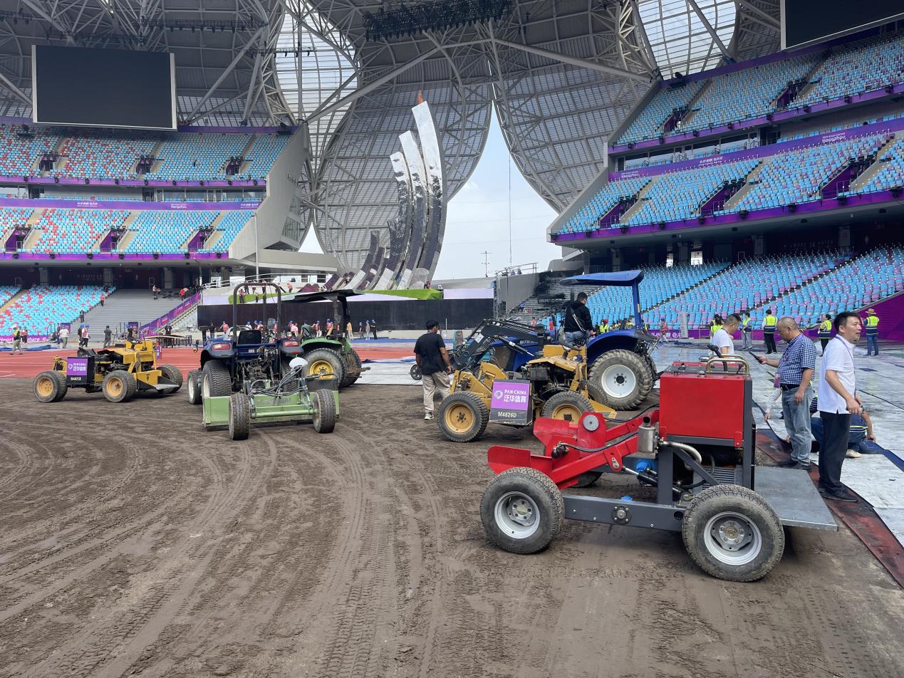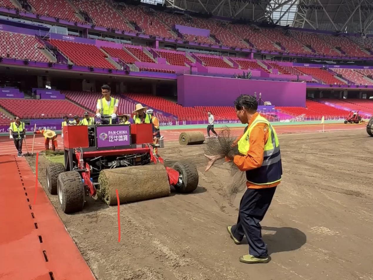 With the successful conclusion of the opening ceremony of the Hangzhou Asian Games at the "Big Lotus", the competition venues have been in a rush to change. What awaits us was a challenge race against time. To ensure safe and orderly construction, the project team commander customized a precise task division table, which was accurate to the time and assigned responsibilities to individuals. The teams were divided into several groups, including the grass area grass-cutting group, the grass roll transportation group, the mechanical coordination group, the track cleaning group, the logistics support group, the safety emergency group, and the on-site publicity group, which take turns to work. A total of over 50 transport vehicles and mechanical equipment were put into use, including 25 transport trucks, 4 forklifts, 4 grass roll transport vehicles, 4 grass laying vehicles, 2 road rollers, and 2 SMG track cleaning vehicles, etc.
