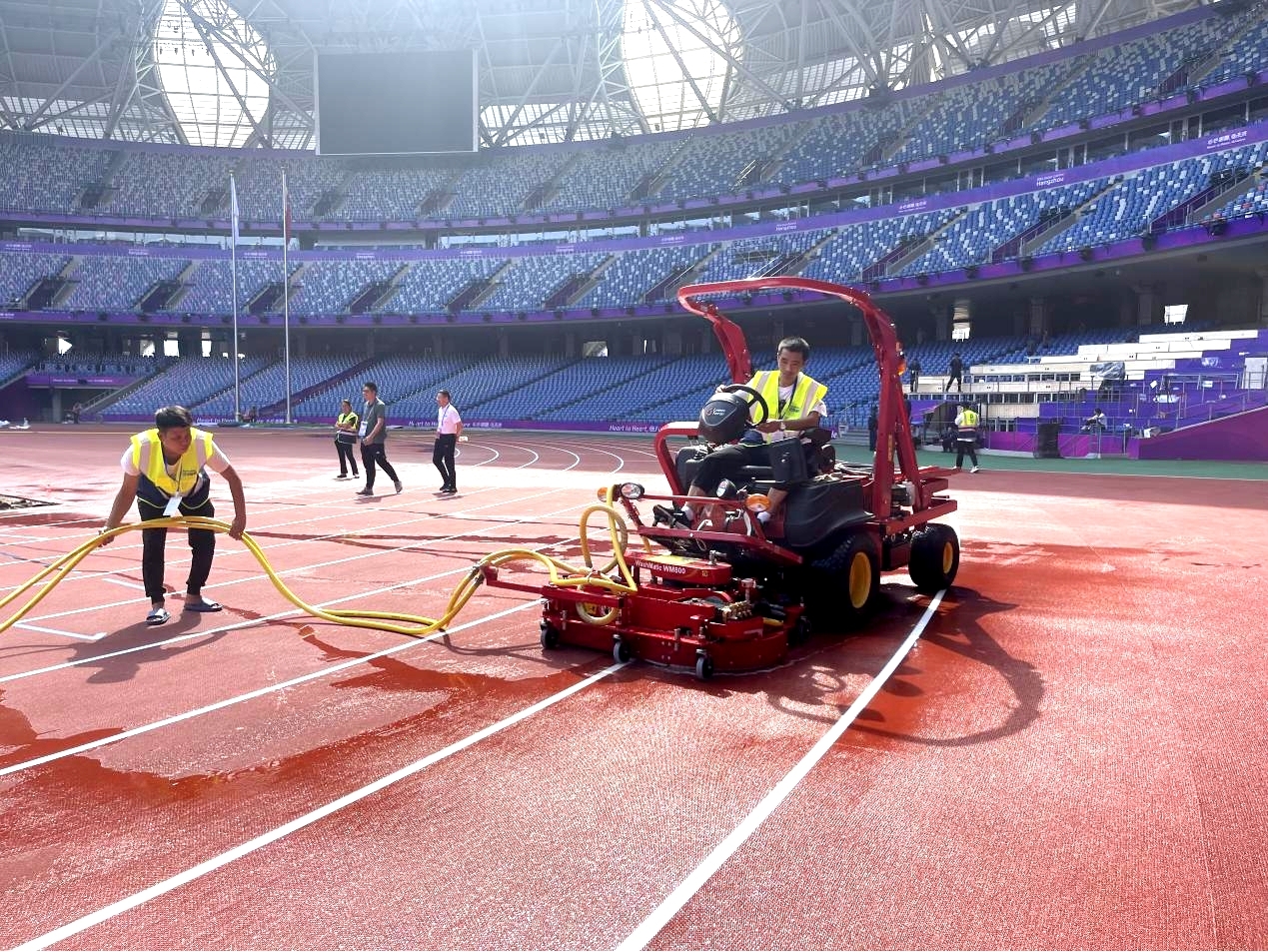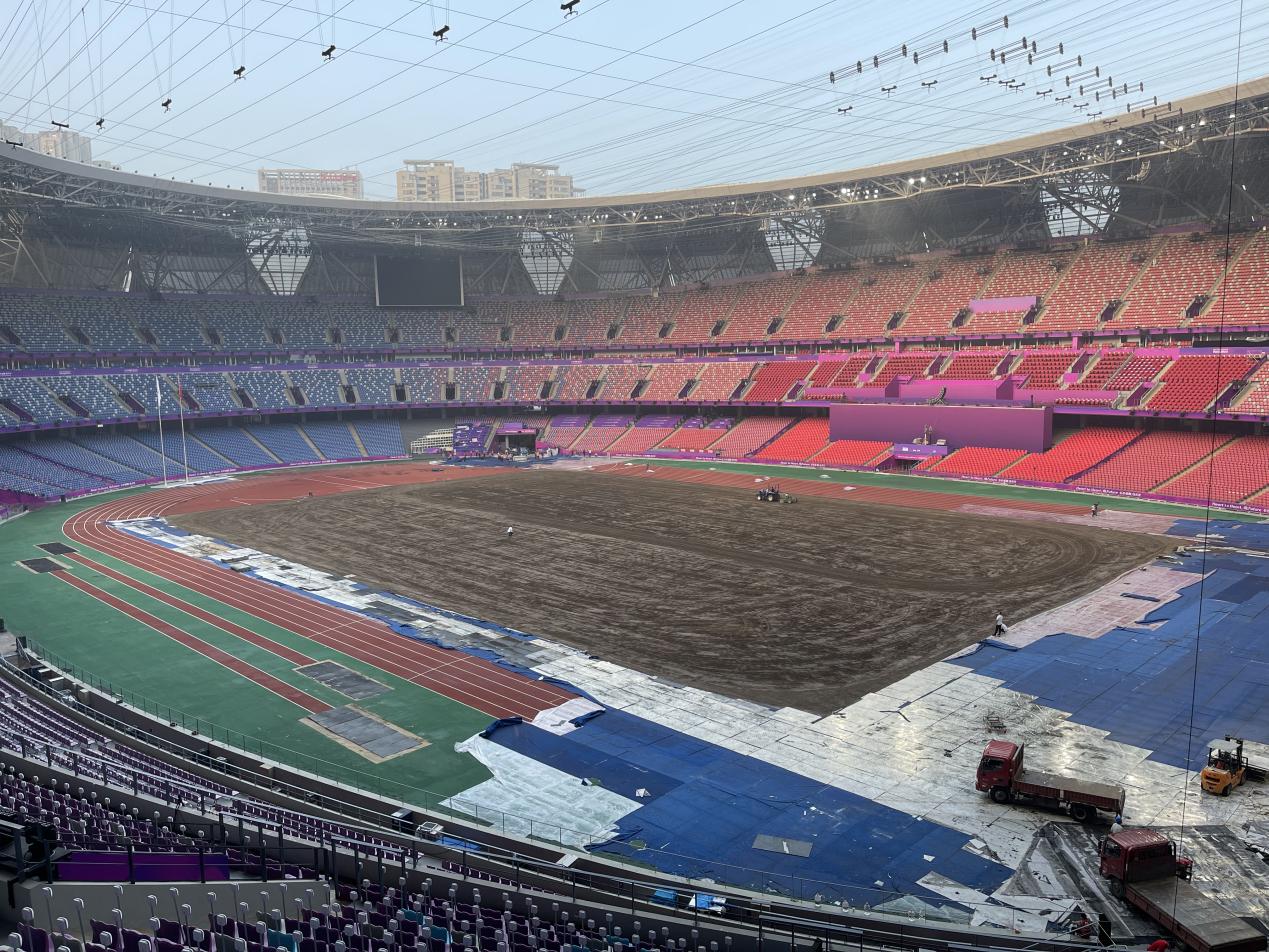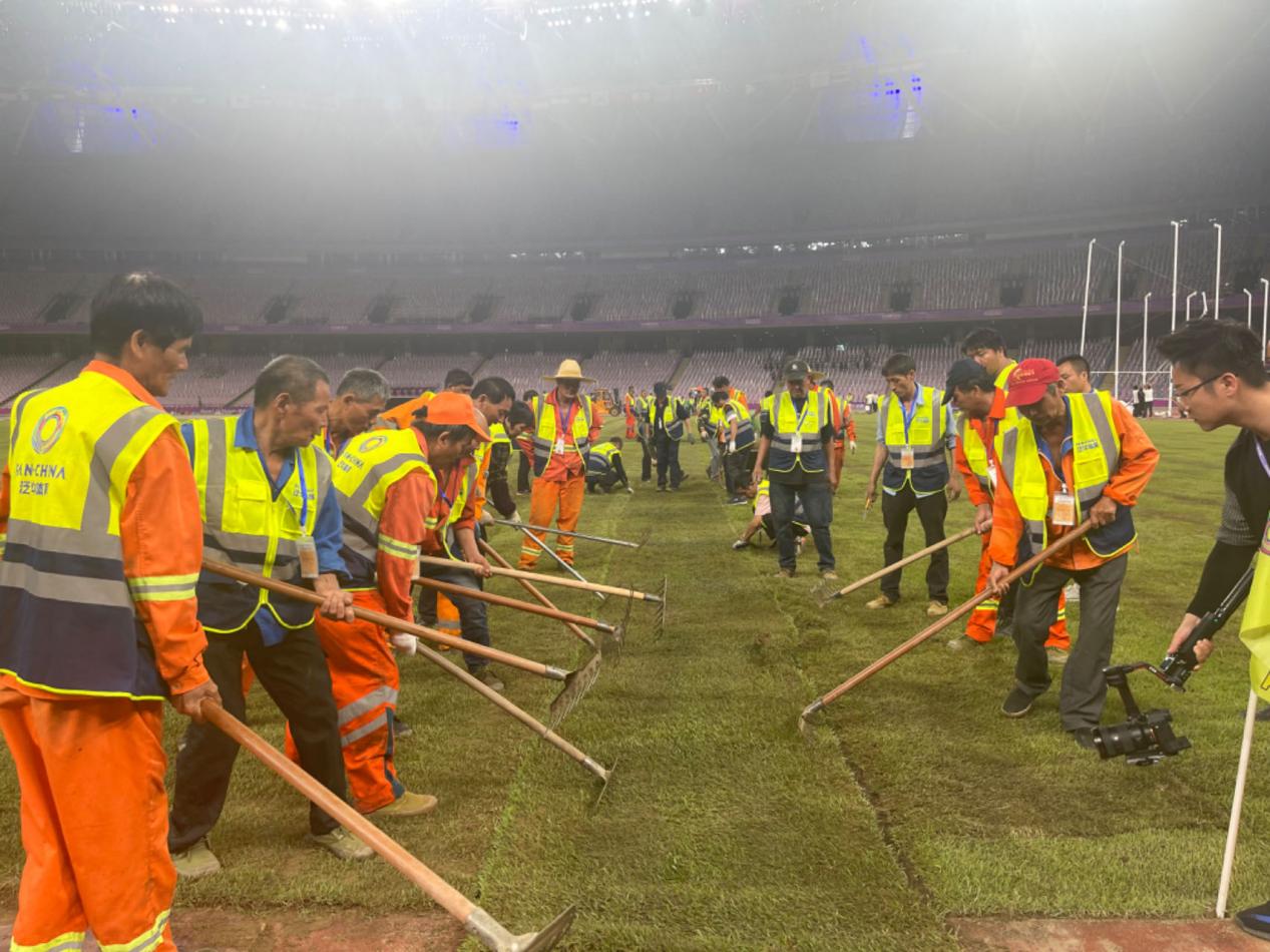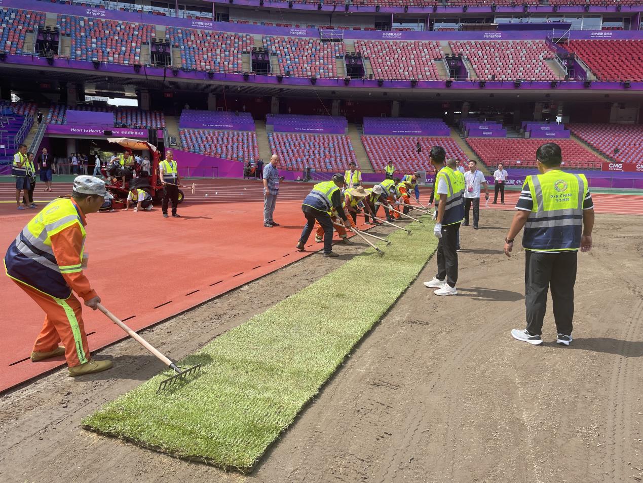 With the successful conclusion of the opening ceremony of the Hangzhou Asian Games at the "Big Lotus", the competition venues have been in a rush to change. What awaits us was a challenge race against time. To ensure safe and orderly construction, the project team commander customized a precise task division table, which was accurate to the time and assigned responsibilities to individuals. The teams were divided into several groups, including the grass area grass-cutting group, the grass roll transportation group, the mechanical coordination group, the track cleaning group, the logistics support group, the safety emergency group, and the on-site publicity group, which take turns to work. A total of over 50 transport vehicles and mechanical equipment were put into use, including 25 transport trucks, 4 forklifts, 4 grass roll transport vehicles, 4 grass laying vehicles, 2 road rollers, and 2 SMG track cleaning vehicles, etc.