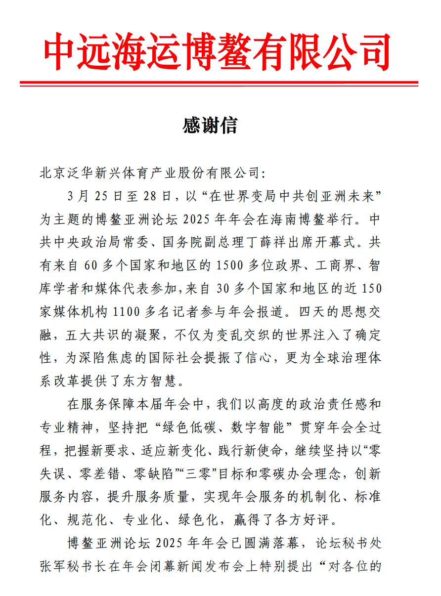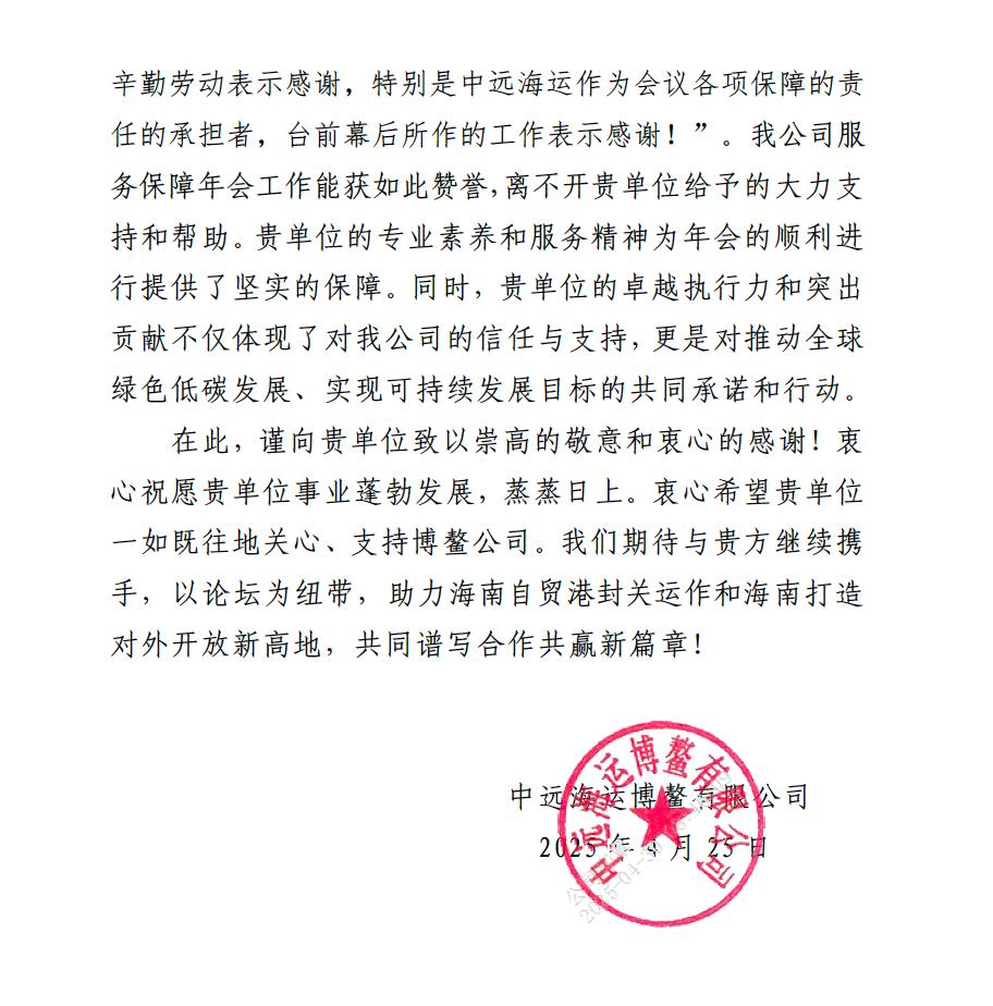 At present, the practice field has started operating, and the field will be officially opened in late May. The political security task for this year's meeting has been successfully completed. For this, the owner(COSCO Shipping Boao Co., Ltd.) hereby sent a letter to express gratitude.